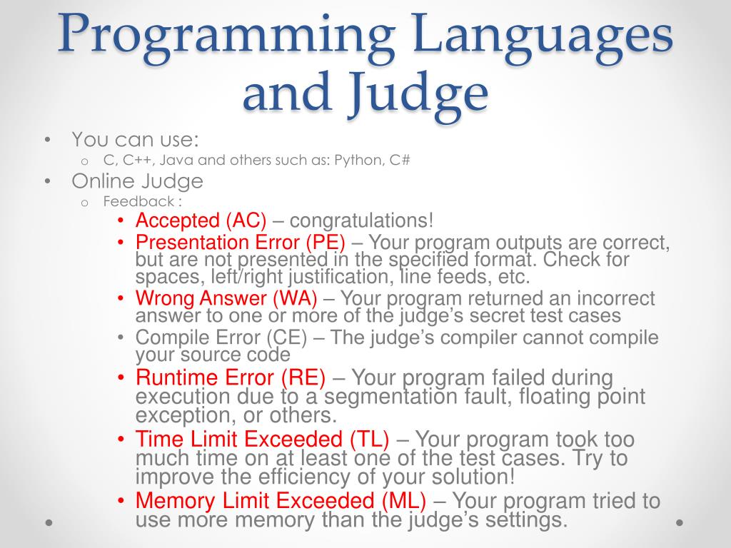 Programming Languages and Judge • You can use: • C, C++, Java and others such as: Python, C# • Online Judge • Feedback : • Accepted (AC) – congratulations! • Presentation Error (PE) – Your program outputs are correct, but are not presented in the specified format. Check for spaces, left/right justification, line feeds, etc. • Wrong Answer (WA) – Your program returned an incorrect answer to one or more of the judge’s secret test cases • Compile Error (CE) – The judge’s compiler cannot compile your source code • Runtime Error (RE) – Your program failed during execution due to a segmentation fault, floating point exception, or others. • Time Limit Exceeded (TL) – Your program took too much time on at least one of the test cases. Try to improve the efficiency of your solution! • Memory Limit Exceeded (ML) – Your program tried to use more memory than the judge’s settings.