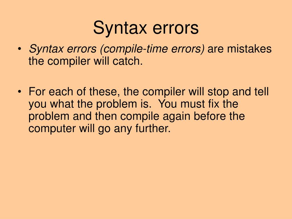 Syntax errors • Syntax errors (compile-time errors) are mistakes the compiler will catch. • For each of these, the compiler will stop and tell you what the problem is. You must fix the problem and then compile again before the computer will go any further.