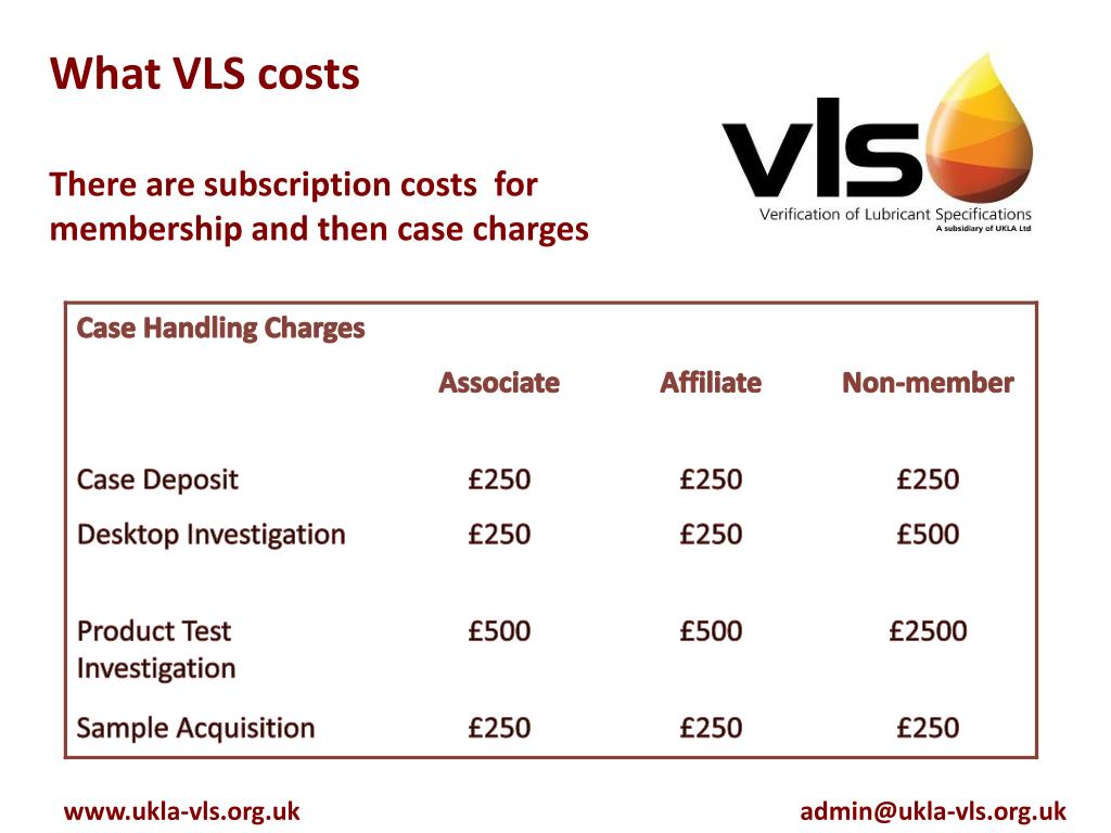 What VLS costsThere are subscription costs for membership and then case charges • Member Subscription charges are used to fund organisational costs • Case charges fund product evaluations • Non refundable deposit required for each case • Non refundable deposit - deterrent against contrived accusations • Offset against Case Handling Charges if case is upheld Variable rates to reflect member company size