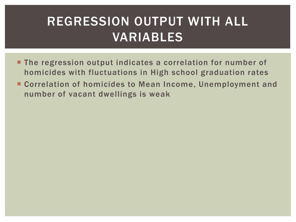 Regression Output with all variables • The regression output indicates a correlation for number of homicides with fluctuations in High school graduation rates • Correlation of homicides to Mean Income, Unemploymentand number of vacant dwellings is weak