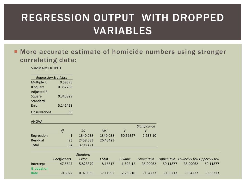 Regression output with dropped variables • More accurate estimate of homicide numbers using stronger correlating data: