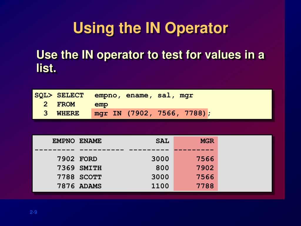 Using the IN Operator • Use the IN operator to test for values in a list. SQL> SELECT empno, ename, sal, mgr 2 FROM emp 3 WHERE mgr IN (7902, 7566, 7788); EMPNO ENAME SAL MGR --------- ---------- --------- --------- 7902 FORD 3000 7566 7369 SMITH 800 7902 7788 SCOTT 3000 7566 7876 ADAMS 1100 7788