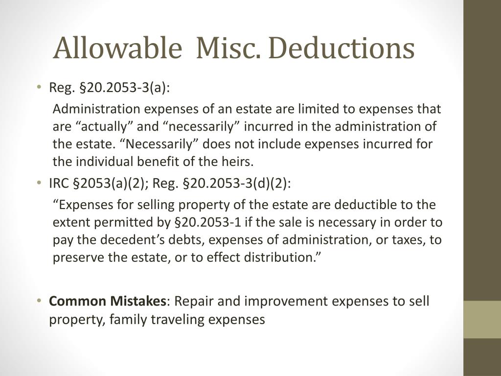 Allowable Misc. Deductions • Reg. §20.2053-3(a): Administration expenses of an estate are limited to expenses that are “actually” and “necessarily” incurred in the administration of the estate. “Necessarily” does not include expenses incurred for the individual benefit of the heirs. • IRC §2053(a)(2); Reg. §20.2053-3(d)(2): “Expenses for selling property of the estate are deductible to the extent permitted by §20.2053-1 if the sale is necessary in order to pay the decedent’s debts, expenses of administration, or taxes, to preserve the estate, or to effect distribution.” • Common Mistakes: Repair and improvement expenses to sell property, family traveling expenses