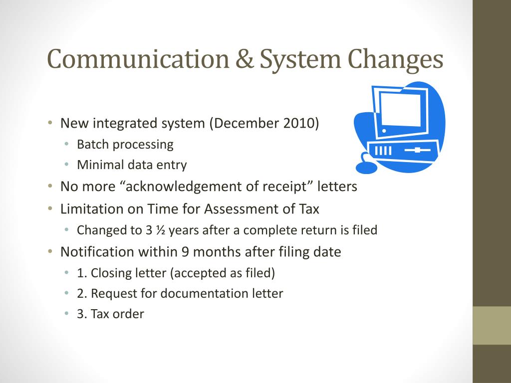 Communication & System Changes • New integrated system (December 2010) • Batch processing • Minimal data entry • No more “acknowledgement of receipt” letters • Limitation on Time for Assessment of Tax • Changed to 3 ½ years after a complete return is filed • Notification within 9 months after filing date • 1. Closing letter (accepted as filed) • 2. Request for documentation letter • 3. Tax order