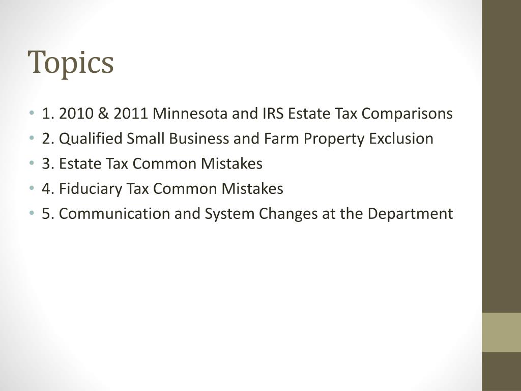 Minnesota Estate Tax . Cori Calhoun, Revenue Tax Supervisor April Drube, Revenue Tax Specialist. Topics. 1. 2010 & 2011 Minnesota and IRS Estate Tax Comparisons 2. Qualified Small Business and Farm Property Exclusion 3. Estate Tax Common Mistakes 4. Fiduciary Tax Common Mistakes