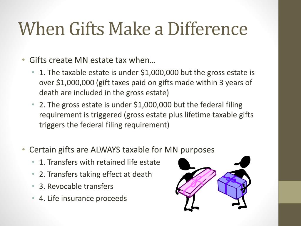 When Gifts Make a Difference • Gifts create MN estate tax when… • 1. The taxable estate is under $1,000,000 but the gross estate is over $1,000,000 (gift taxes paid on gifts made within 3 years of death are included in the gross estate) • 2. The gross estate is under $1,000,000 but the federal filing requirement is triggered (gross estate plus lifetime taxable gifts triggers the federal filing requirement) • Certain gifts are ALWAYS taxable for MN purposes • 1. Transfers with retained life estate • 2. Transfers taking effect at death • 3. Revocable transfers • 4. Life insurance proceeds