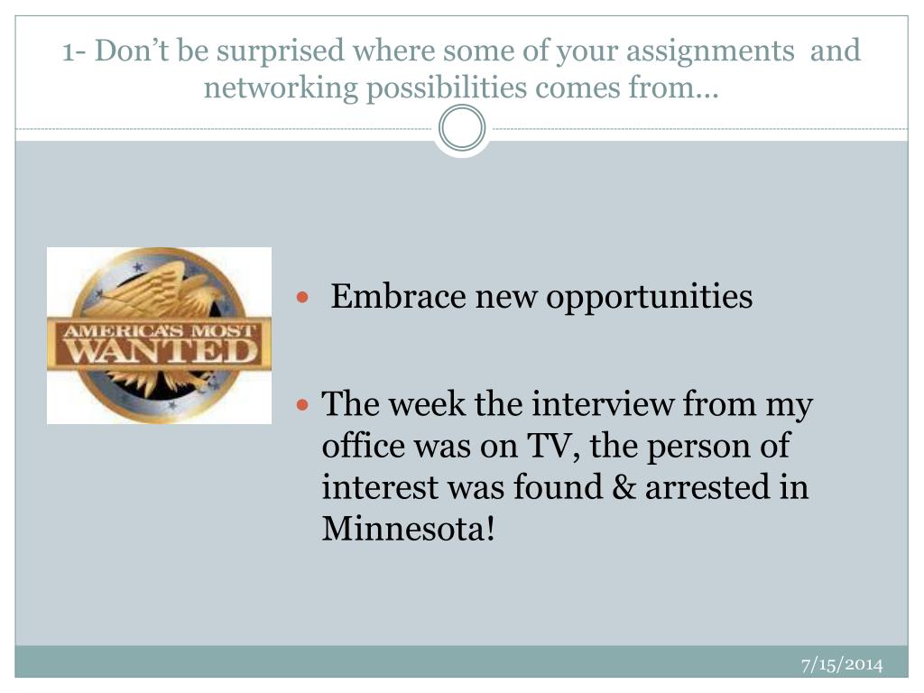 Embrace new opportunities 1- Don’t be surprised where some of your assignments and networking possibilities comes from... • The week the interview from my office was on TV, the person of interest was found & arrested in Minnesota!