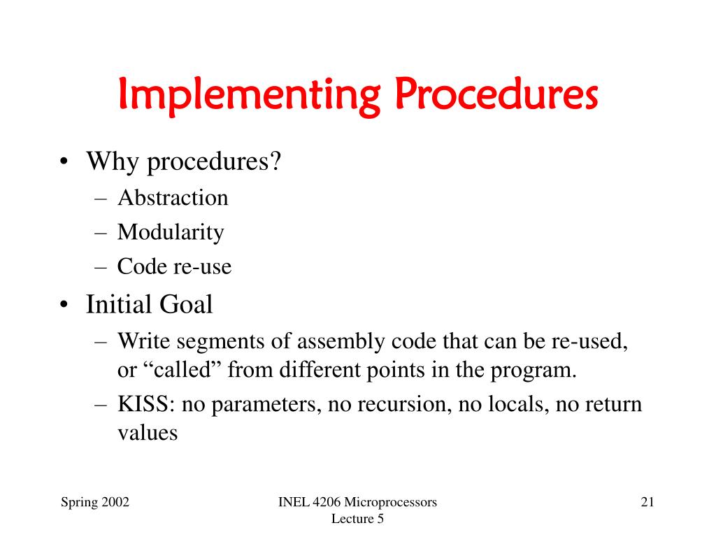Implementing Procedures • Why procedures? • Abstraction • Modularity • Code re-use • Initial Goal • Write segments of assembly code that can be re-used, or “called” from different points in the program. • KISS: no parameters, no recursion, no locals, no return values INEL 4206 Microprocessors Lecture 5