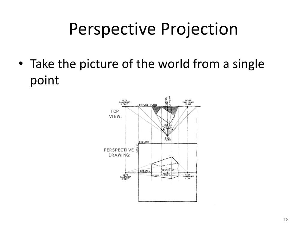 Projection Types • Perspective projection • Just like our eyes and cameras • Orthographic projection • Architectural drawing with no distance distortion