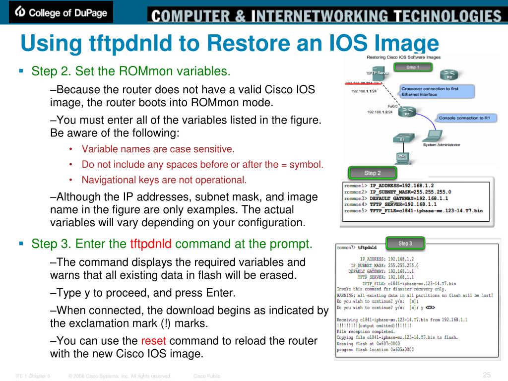 Using tftpdnld to Restore an IOS Image Step 2. Set the ROMmon variables. Because the router does not have a valid Cisco IOS image, the router boots into ROMmon mode. You must enter all of the variables listed in the figure. Be aware of the following: Variable names are case sensitive. Do not include any spaces before or after the = symbol. Navigational keys are not operational. Although the IP addresses, subnet mask, and image name in the figure are only examples. The actual variables will vary depending on your configuration. Step 3. Enter the tftpdnld command at the prompt. The command displays the required variables and warns that all existing data in flash will be erased. Type y to proceed, and press Enter. When connected, the download begins as indicated by the exclamation mark (!) marks. You can use the reset command to reload the router with the new Cisco IOS image.