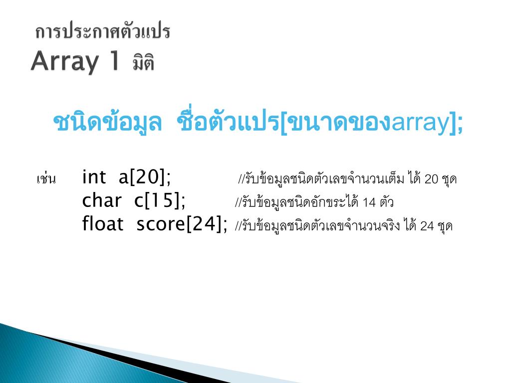 การประกาศตัวแปรArray 1 มิติ ชนิดข้อมูล ชื่อตัวแปร[ขนาดของarray]; เช่น int a[20]; //รับข้อมูลชนิดตัวเลขจำนวนเต็ม ได้ 20 ชุด char c[15];//รับข้อมูลชนิดอักขระได้ 14 ตัว float score[24];//รับข้อมูลชนิดตัวเลขจำนวนจริง ได้ 24 ชุด