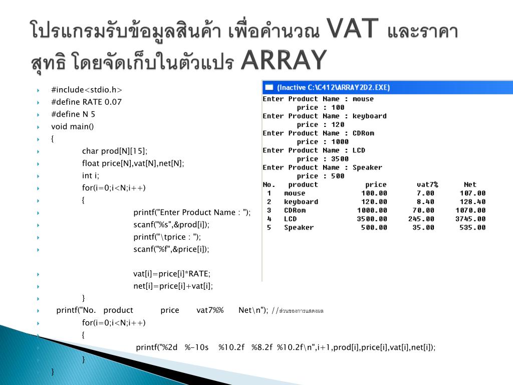 โปรแกรมรับข้อมูลสินค้า เพื่อคำนวณ VAT และราคาสุทธิ โดยจัดเก็บในตัวแปร ARRAY • #include<stdio.h> • #define RATE 0.07 • #define N 5 • void main() • { • char prod[N][15]; • float price[N],vat[N],net[N]; • inti; • for(i=0;i<N;i++) • { • printf("Enter Product Name : "); • scanf("%s",&prod[i]); • printf("\tprice : "); • scanf("%f",&price[i]); • vat[i]=price[i]*RATE; • net[i]=price[i]+vat[i]; • } • printf("No. product price vat7%% Net\n"); //ส่วนของการแสดงผล • for(i=0;i<N;i++) • { • printf("%2d %-10s %10.2f %8.2f %10.2f\n",i+1,prod[i],price[i],vat[i],net[i]); • } • }