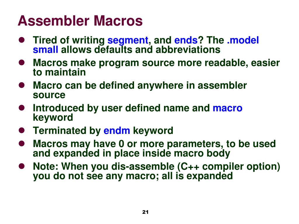 Assembler Macros Tired of writing segment, and ends? The .model small allows defaults and abbreviations Macros make program source more readable, easier to maintain Macro can be defined anywhere in assembler source Introduced by user defined name and macrokeyword Terminated by endmkeyword Macros may have 0 or more parameters, to be used and expanded in place inside macro body Note: When you dis-assemble (C++ compiler option) you do not see any macro; all is expanded