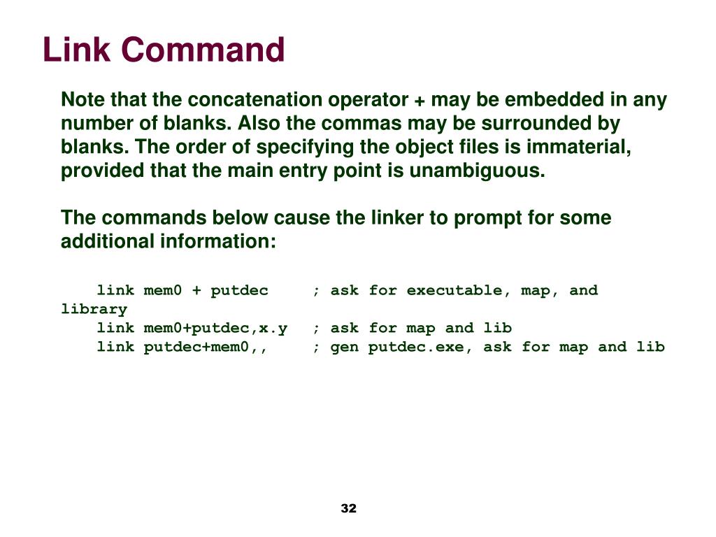 Link Command Note that the concatenation operator + may be embedded in any number of blanks. Also the commas may be surrounded by blanks. The order of specifying the object files is immaterial, provided that the main entry point is unambiguous. The commands below cause the linker to prompt for some additional information: link mem0 + putdec ; ask for executable, map, and library link mem0+putdec,x.y ; ask for map and lib link putdec+mem0,, ; gen putdec.exe, ask for map and lib