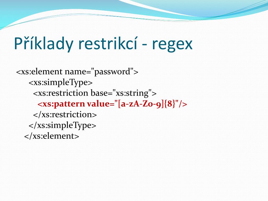 Příklady restrikcí - regex <xs:element name="password"> <xs:simpleType> <xs:restriction base="xs:string"><xs:patternvalue="[a-zA-Z0-9]{8}"/> </xs:restriction> </xs:simpleType></xs:element>