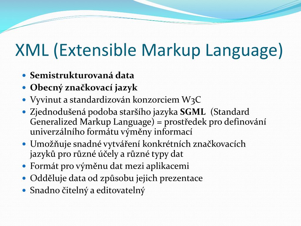 Příklady aplikace XML (2) • SVG – ScalableVectorGraphicsje jazyk pro popis dvourozměrné vektorové grafiky, statické i dynamické (animace). • MathML – MathematicalMarkupLanguageje značkovací jazyk pro popis matematických vzorců a symbolů pro použití na webu. • DocBook – Sada definic dokumentů a stylů pro publikační činnost.