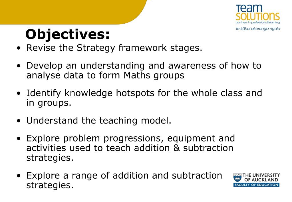 Objectives: • Revise the Strategy framework stages. • Develop an understanding and awareness of how to analyse data to form Maths groups • Identify knowledge hotspots for the whole class and in groups. • Understand the teaching model. • Explore problem progressions, equipment and activities used to teach addition & subtraction strategies. • Explore a range of addition and subtraction strategies.