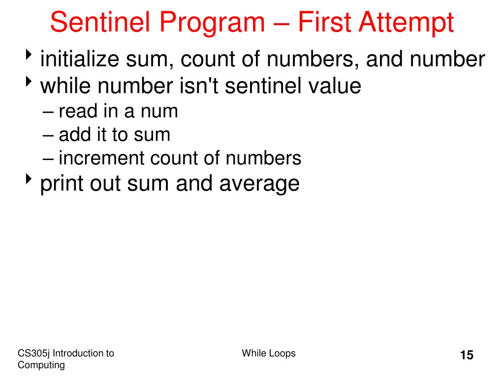 Sentinel Program – First Attempt • initialize sum, count of numbers, and number • while number isn't sentinel value • read in a num • add it to sum • increment count of numbers • print out sum and average While Loops