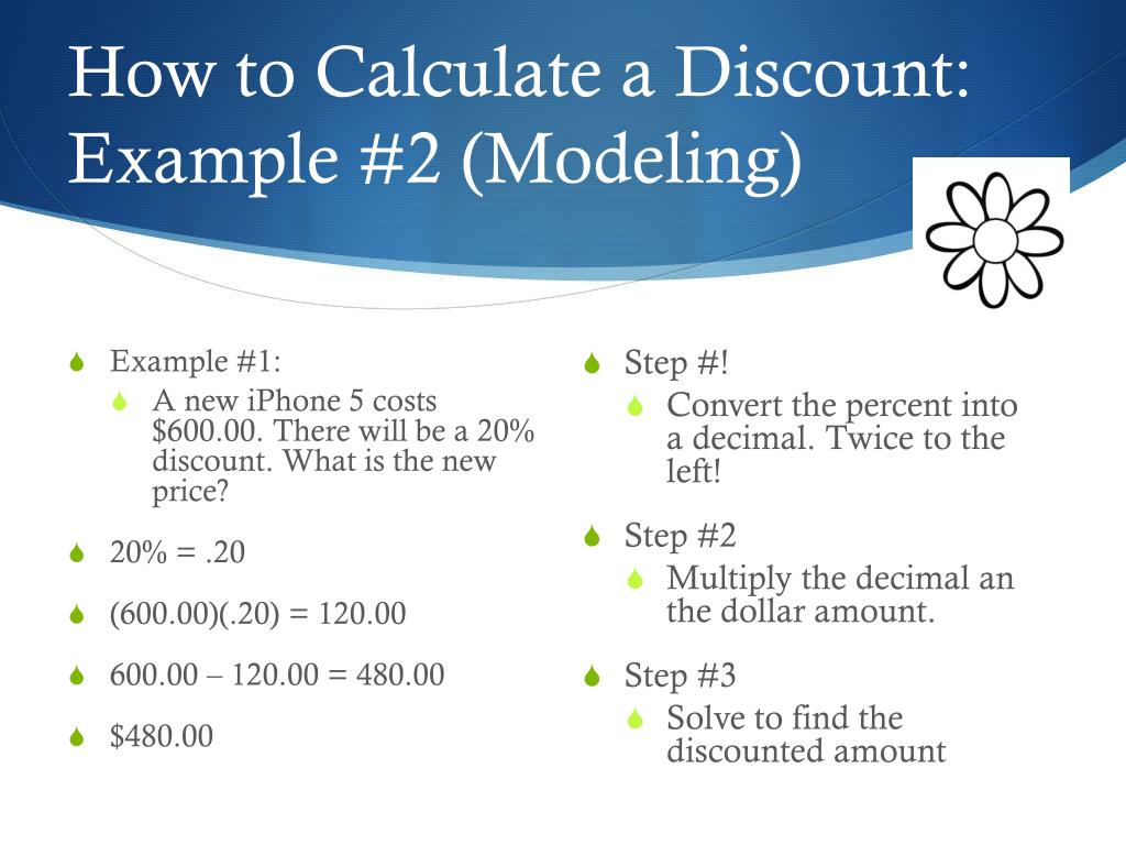 How to Calculate a Discount:Example #2 (Modeling) • Example #1: • A new iPhone 5 costs $600.00. There will be a 20% discount. What is the new price? • 20% = .20 • (600.00)(.20) = 120.00 • 600.00 – 120.00 = 480.00 • $480.00 • Step #! • Convert the percent into a decimal. Twice to the left! • Step #2 • Multiply the decimal an the dollar amount. • Step #3 • Solve to find the discounted amount