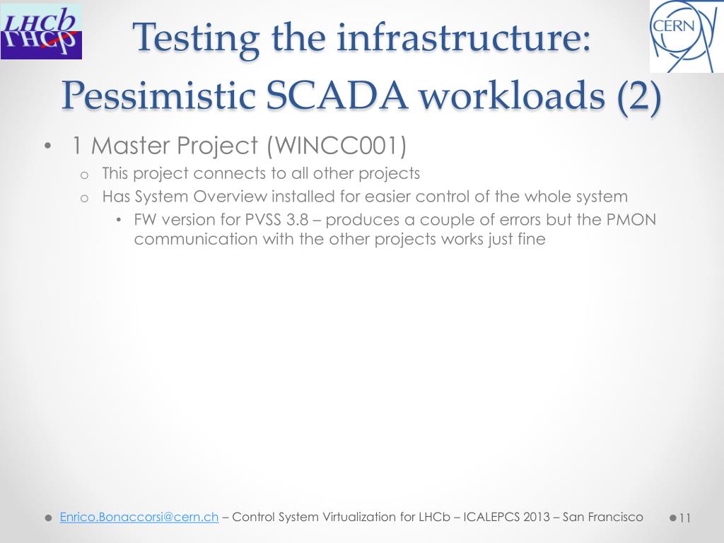 Testing the infrastructure: Pessimistic SCADA workloads (2) • 1 Master Project (WINCC001) • This project connects to all other projects • Has System Overview installed for easier control of the whole system • FW version for PVSS 3.8 – produces a couple of errors but the PMON communication with the other projects works just fine Enrico.Bonaccorsi@cern.ch – Control System Virtualization for LHCb – ICALEPCS 2013 – San Francisco