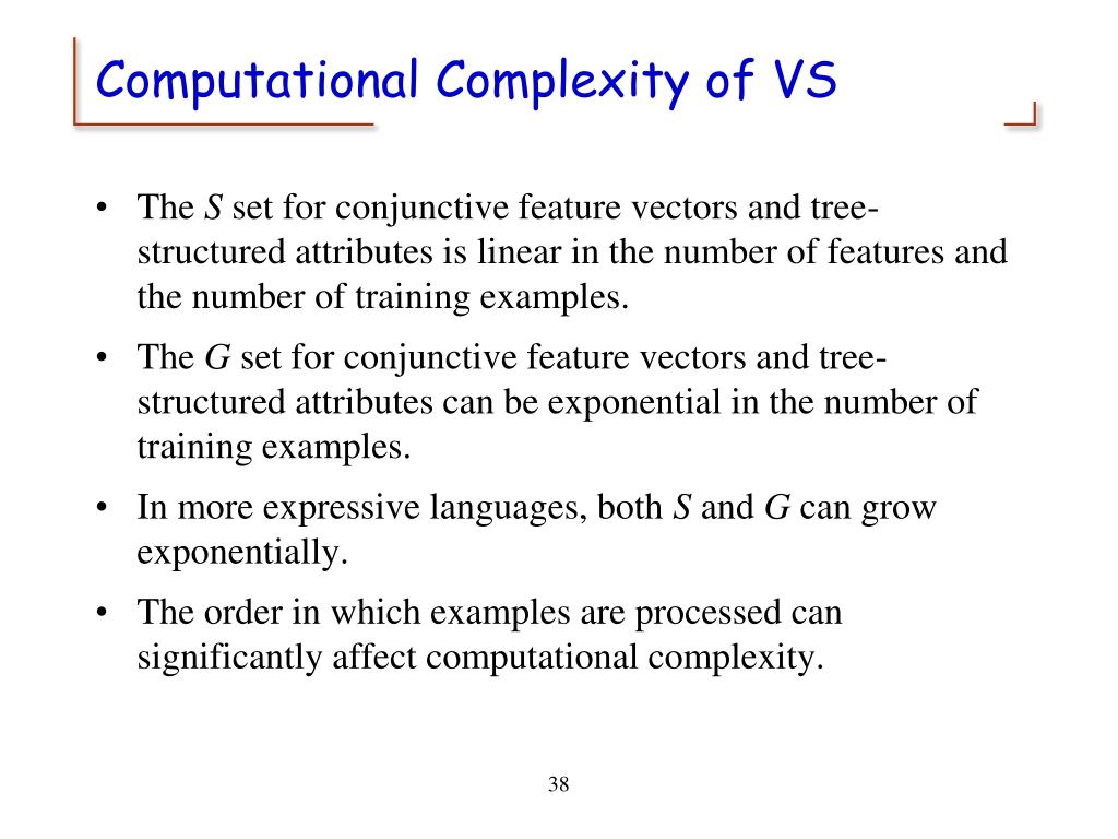 Computational Complexity of VS • The S set for conjunctive feature vectors and tree-structured attributes is linear in the number of features and the number of training examples. • The G set for conjunctive feature vectors and tree-structured attributes can be exponential in the number of training examples. • In more expressive languages, both S and G can grow exponentially. • The order in which examples are processed can significantly affect computational complexity.