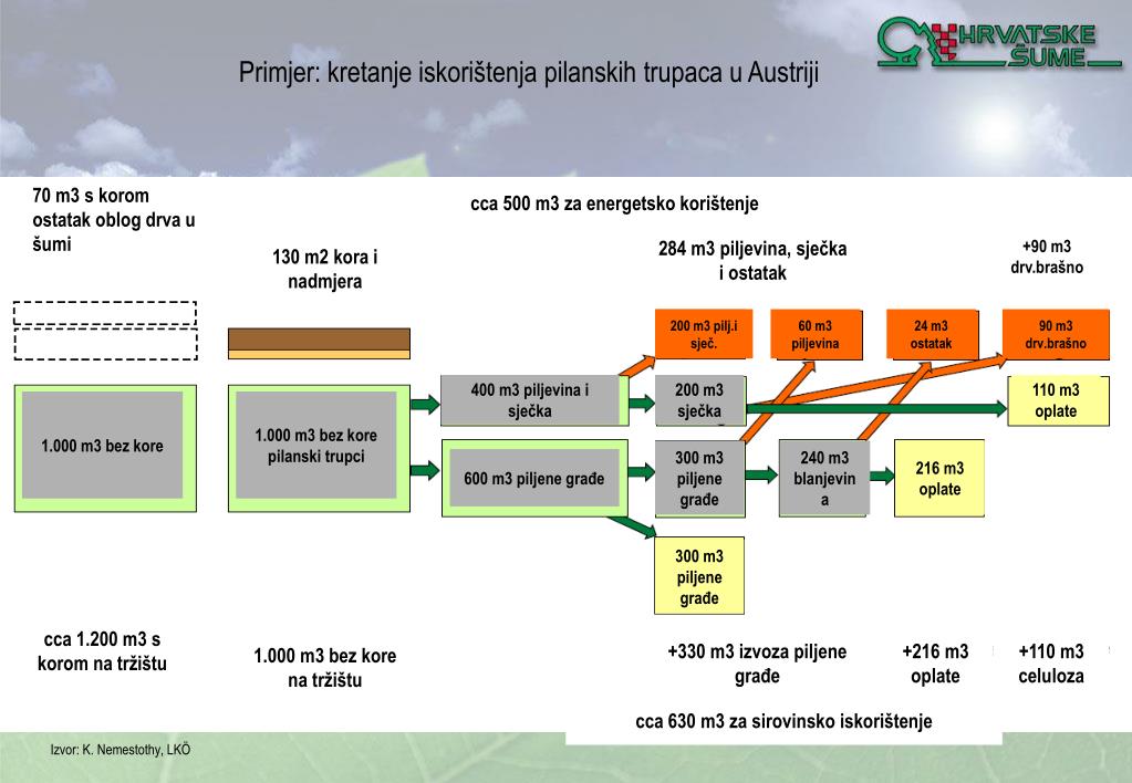 Primjer: kretanje iskorištenja pilanskih trupaca u Austriji 70 m3 s koromostatak oblog drva u šumi cca 500 m3 za energetsko korištenje 284 m3 piljevina, sječka i ostatak +90 m3 drv.brašno 130 m2 kora i nadmjera 200 m3 pilj.i sječ. 60 m3 piljevina 24 m3 ostatak 90 m3 drv.brašno 400 m3 piljevina i sječka 200 m3 sječka 110 m3 oplate 1.000 m3 bez kore 1.000 m3 bez kore pilanski trupci 300 m3 piljene građe 240 m3 blanjevina 216 m3 oplate 600 m3 piljene građe 300 m3 piljene građe cca 1.200 m3 s korom na tržištu 1.000 m3 bez kore na tržištu +330 m3 izvoza piljene građe +216 m3 oplate +110 m3 celuloza cca 630 m3 za sirovinsko iskorištenje Izvor: K. Nemestothy, LKÖ