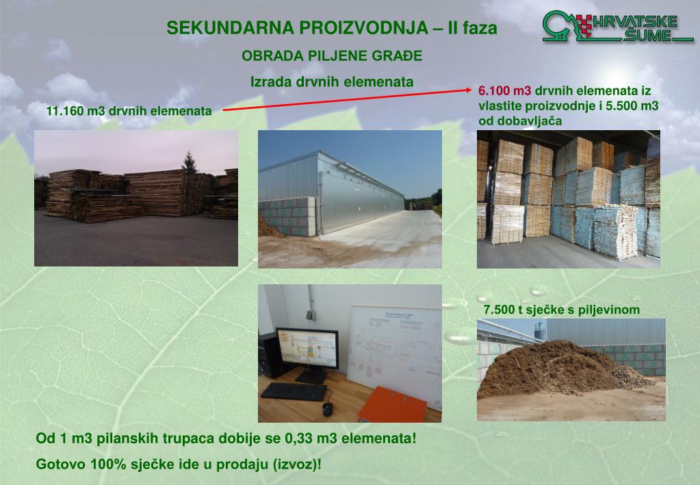 SEKUNDARNA PROIZVODNJA – II faza OBRADA PILJENE GRAĐE Izrada drvnih elemenata 6.100m3 drvnih elemenata iz vlastite proizvodnje i 5.500 m3 od dobavljača 11.160 m3 drvnih elemenata 7.500 t sječke s piljevinom Od 1 m3 pilanskih trupaca dobije se 0,33 m3 elemenata! Gotovo 100% sječke ide u prodaju (izvoz)!
