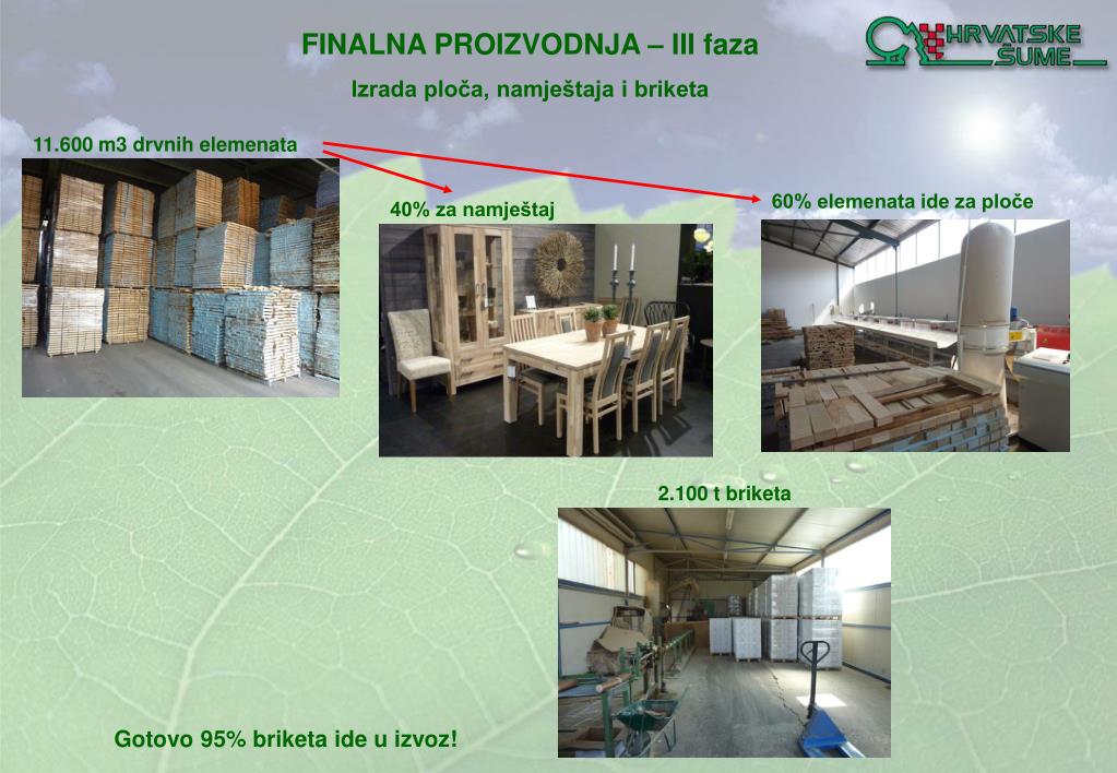 FINALNA PROIZVODNJA – III faza Izrada ploča, namještaja i briketa 11.600 m3 drvnih elemenata 60% elemenata ide za ploče 40% za namještaj 2.100 t briketa Gotovo 95% briketa ide u izvoz!