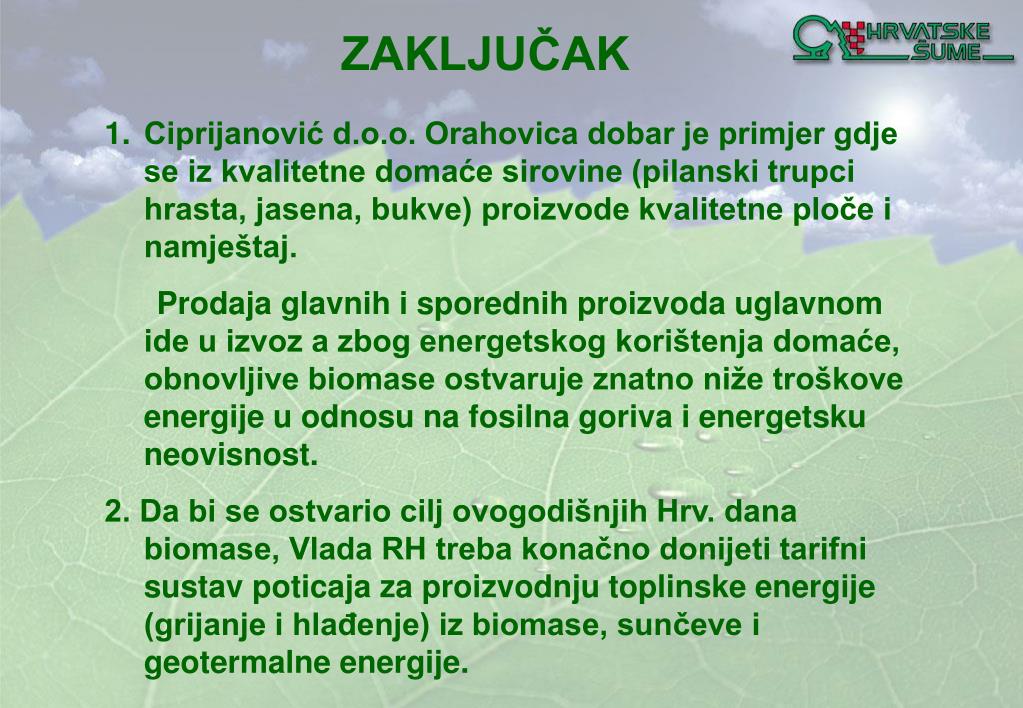 ZAKLJUČAK • Ciprijanović d.o.o. Orahovica dobar je primjer gdje se iz kvalitetne domaće sirovine (pilanski trupci hrasta, jasena, bukve) proizvode kvalitetne ploče i namještaj. • Prodaja glavnih i sporednih proizvoda uglavnom ide u izvoz a zbog energetskog korištenja domaće, obnovljive biomase ostvaruje znatno niže troškove energije u odnosu na fosilna goriva i energetsku neovisnost. • 2. Da bi se ostvario cilj ovogodišnjih Hrv. dana biomase, Vlada RH treba konačno donijeti tarifni sustav poticaja za proizvodnju toplinske energije (grijanje i hlađenje) iz biomase, sunčeve i geotermalne energije.
