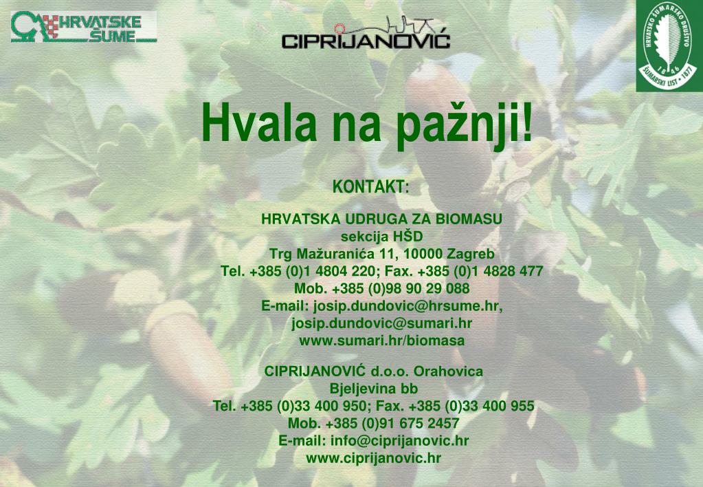 HRVATSKA UDRUGA ZA BIOMASU sekcija HŠDTrg Mažuranića 11, 10000 ZagrebTel. +385 (0)1 4804 220; Fax. +385 (0)1 4828 477Mob. +385 (0)98 90 29 088E-mail: josip.dundovic@hrsume.hr, josip.dundovic@sumari.hrwww.sumari.hr/biomasa Hvala na pažnji! KONTAKT: CIPRIJANOVIĆ d.o.o. Orahovica Bjeljevina bbTel. +385 (0)33 400 950; Fax. +385 (0)33 400 955Mob. +385 (0)91 675 2457E-mail: info@ciprijanovic.hrwww.ciprijanovic.hr