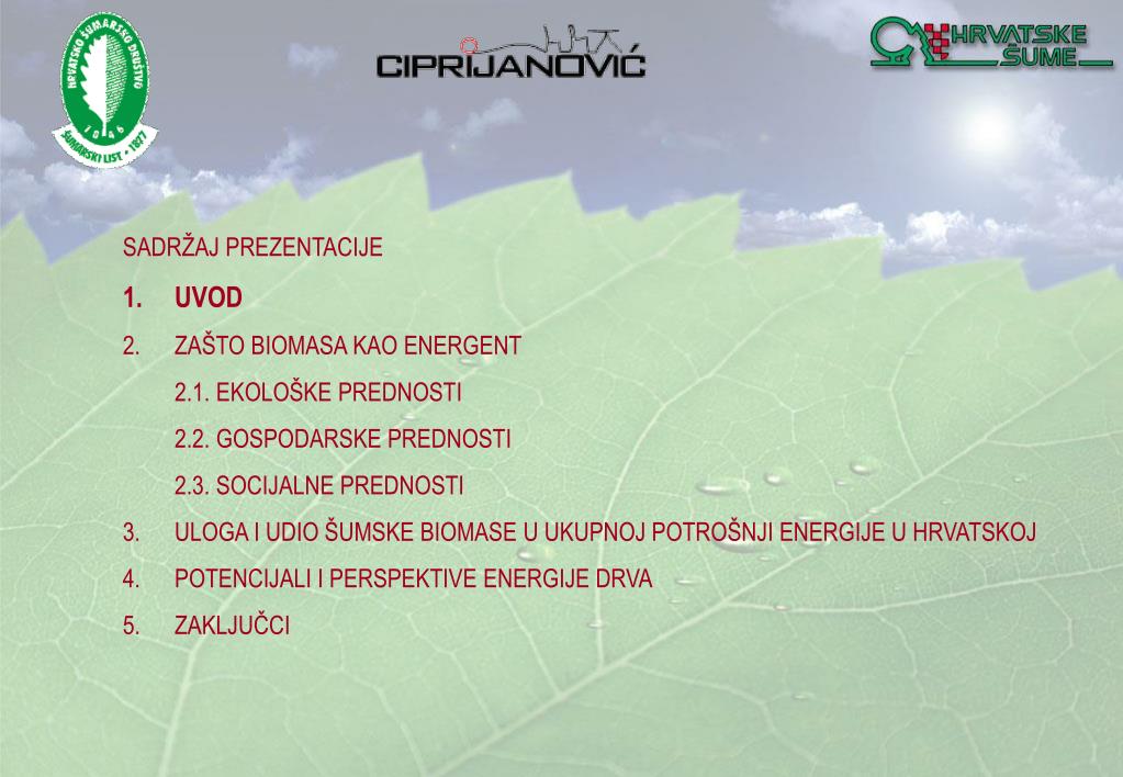 SADRŽAJ PREZENTACIJE • UVOD • ZAŠTO BIOMASA KAO ENERGENT • 2.1. EKOLOŠKE PREDNOSTI • 2.2. GOSPODARSKE PREDNOSTI • 2.3. SOCIJALNE PREDNOSTI • ULOGA I UDIO ŠUMSKE BIOMASE U UKUPNOJ POTROŠNJI ENERGIJE U HRVATSKOJ • POTENCIJALI I PERSPEKTIVE ENERGIJE DRVA • ZAKLJUČCI
