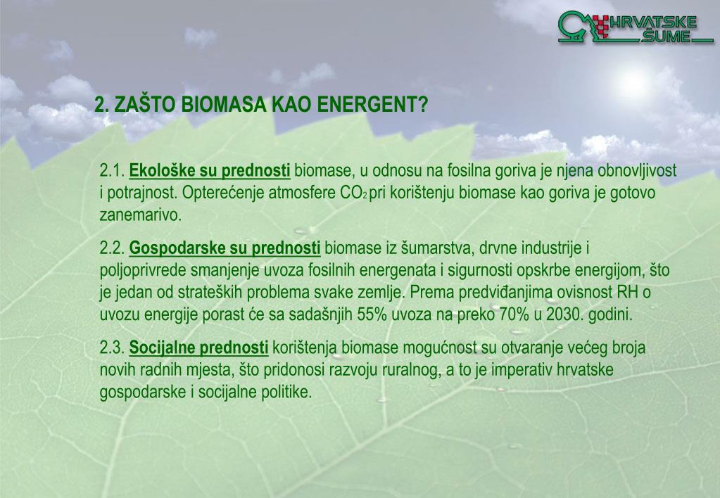 2. ZAŠTO BIOMASA KAO ENERGENT? 2.1. Ekološke su prednosti biomase, u odnosu na fosilna goriva je njena obnovljivost i potrajnost. Opterećenje atmosfere CO2 pri korištenju biomase kao goriva je gotovo zanemarivo. 2.2. Gospodarske su prednosti biomase iz šumarstva, drvne industrije i poljoprivrede smanjenje uvoza fosilnih energenata i sigurnosti opskrbe energijom, što je jedan od strateških problema svake zemlje. Prema predviđanjima ovisnost RH o uvozu energije porast će sa sadašnjih 55% uvoza na preko 70% u 2030. godini. 2.3. Socijalne prednosti korištenja biomase mogućnost su otvaranje većeg broja novih radnih mjesta, što pridonosi razvoju ruralnog, a to je imperativ hrvatske gospodarske i socijalne politike.