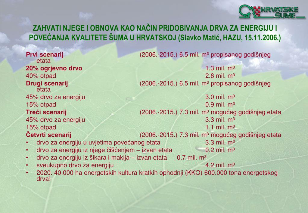 ZAHVATI NJEGE I OBNOVA KAO NAČIN PRIDOBIVANJA DRVA ZA ENERGIJU I POVEĆANJA KVALITETE ŠUMA U HRVATSKOJ (Slavko Matić, HAZU, 15.11.2006.) • Prvi scenarij (2006.-2015.) 6.5 mil. m³propisanog godišnjeg etata • 20% ogrjevno drvo 1.3 mil. m³ • 40% otpad 2.6 mil. m³ • Drugi scenarij (2006.-2015.) 6.5 mil. m³propisanog godišnjeg etata • 45%drvo za energiju 3.0 mil. m³ • 15% otpad 0.9 mil. m³ • Treći scenarij (2006.-2015.) 7.3 mil. m³mogućeg godišnjeg etata • 45% drvo za energiju 3.3 mil. m³ • 15% otpad 1.1 mil. m³ • Četvrti scenarij (2006.-2015.) 7.3 mil. m³mogućeg godišnjeg etata • drvo za energiju u uvjetima povećanog etata 3.3 mil. m³ • drvo za energiju iz njege čišćenjem – izvan etata 0.2 mil. m³ • drvo za energiju iz šikara i makija – izvan etata 0.7 mil. m³ • sveukupno drvo za energiju 4.2 mil. m³ • 2020. 40.000 ha energetskih kultura kratkih ophodnji (KKO) 600.000 tona energetskog drva!
