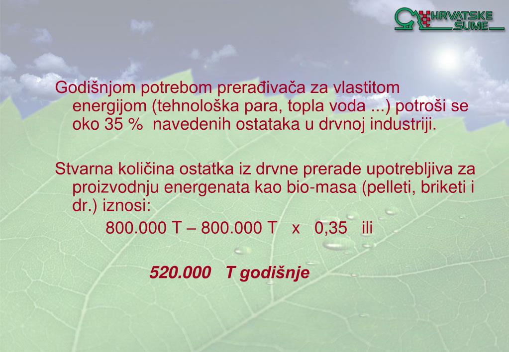Godišnjom potrebom prerađivača za vlastitom energijom (tehnološka para, topla voda ...) potroši se oko 35 % navedenih ostataka u drvnoj industriji. • Stvarna količina ostatka iz drvne prerade upotrebljiva za proizvodnju energenata kao bio-masa (pelleti, briketi i dr.) iznosi: 800.000 T – 800.000T x 0,35 ili 520.000 T godišnje