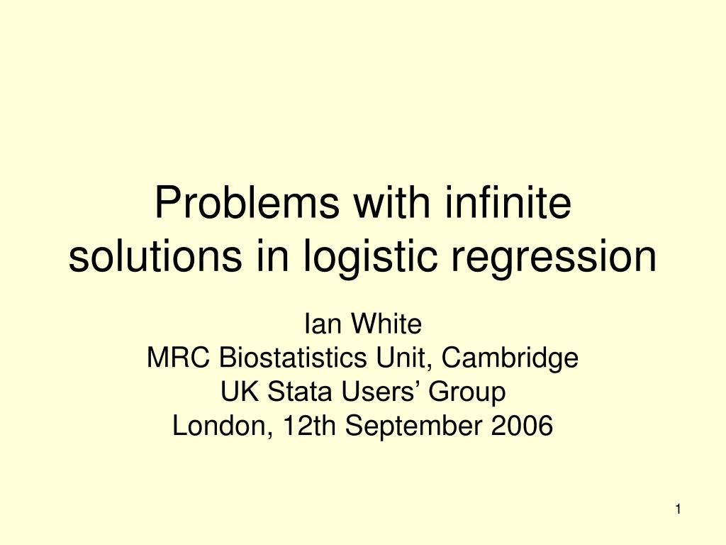Problems with infinite solutions in logistic regression Ian White MRC Biostatistics Unit, Cambridge UK Stata Users’ Group London, 12th September 2006