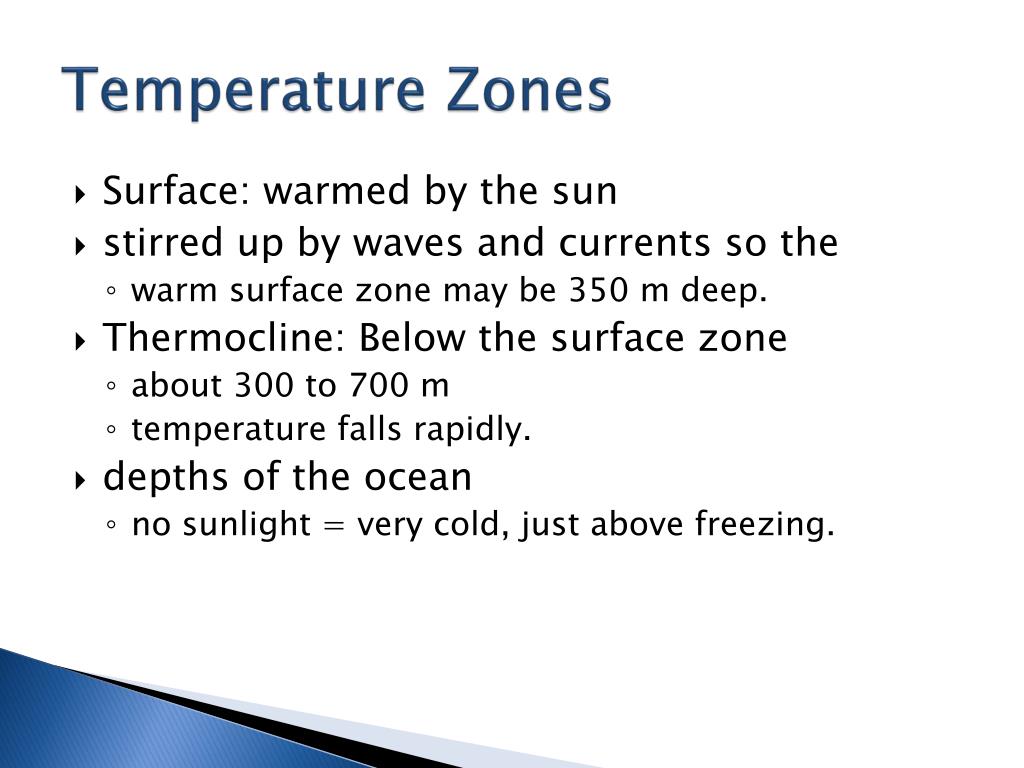 Temperature Zones • Surface: warmed by the sun • stirred up by waves and currents so the • warm surface zone may be 350 m deep. • Thermocline: Below the surface zone • about 300 to 700 m • temperature falls rapidly. • depths of the ocean • no sunlight = very cold, just above freezing.