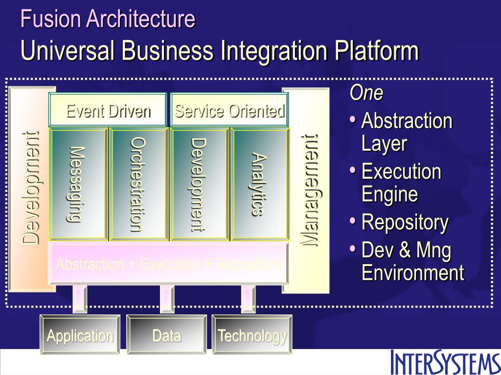 One • AbstractionLayer • ExecutionEngine • Repository • Dev & MngEnvironment Event Driven Service Oriented Messaging Orchestration Development Analytics Abstraction + Execution + Repository Application Data Technology Fusion ArchitectureUniversal Business Integration Platform Development Management