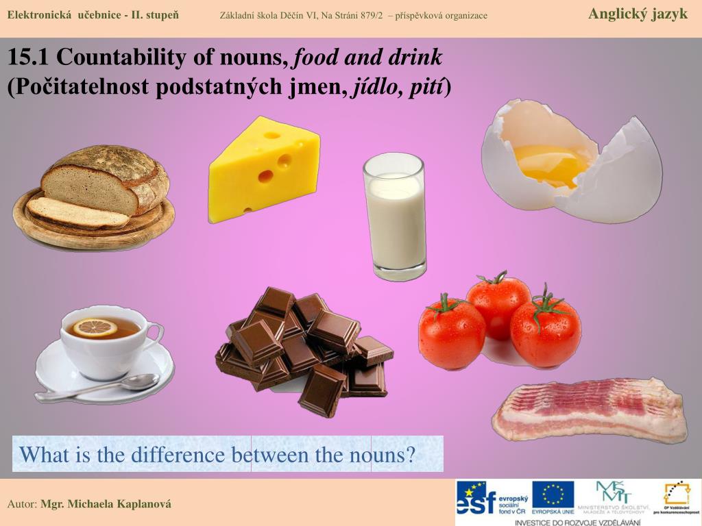 Elektronická učebnice - II. stupeň Základní škola Děčín VI, Na Stráni 879/2 – příspěvková organizace Anglický jazyk 15.1 Countabilityofnouns, food and drink (Počitatelnost podstatných jmen, jídlo, pití) Whatisthedifferencebetweenthenouns? Autor: Mgr. Michaela Kaplanová