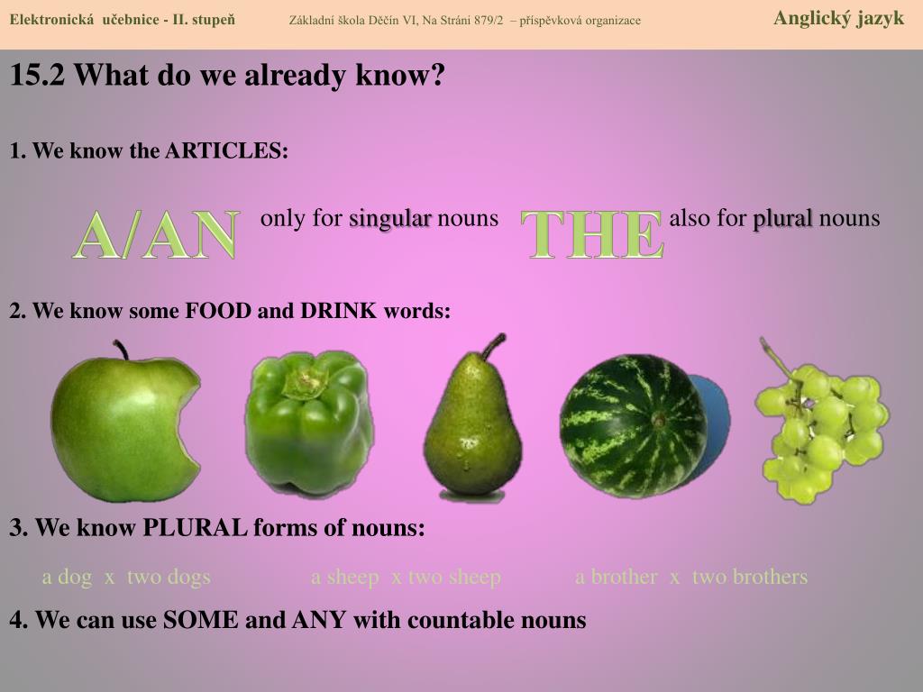 Elektronická učebnice - II. stupeň Základní škola Děčín VI, Na Stráni 879/2 – příspěvková organizace Anglický jazyk 15.2 What do wealreadyknow? 1. Weknowthe ARTICLES: onlyforsingularnounsalsoforpluralnouns 2. Weknowsome FOOD and DRINK words: 3. Weknow PLURAL formsofnouns: 4. Wecan use SOME and ANY withcountablenouns A/AN THE a dog x twodogs asheep x twosheep abrother x twobrothers