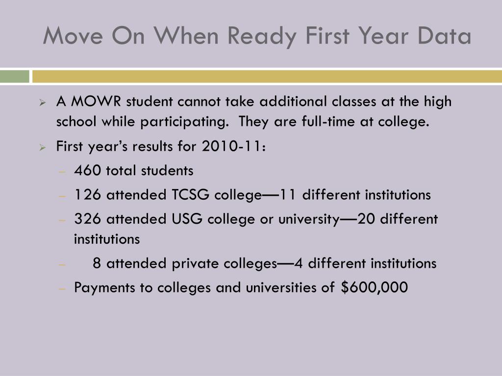 Move On When Ready First Year Data • A MOWR student cannot take additional classes at the high school while participating. They are full-time at college. • First year’s results for 2010-11: • 460 total students • 126 attended TCSG college—11 different institutions • 326 attended USG college or university—20 different institutions • 8 attended private colleges—4 different institutions • Payments to colleges and universities of $600,000