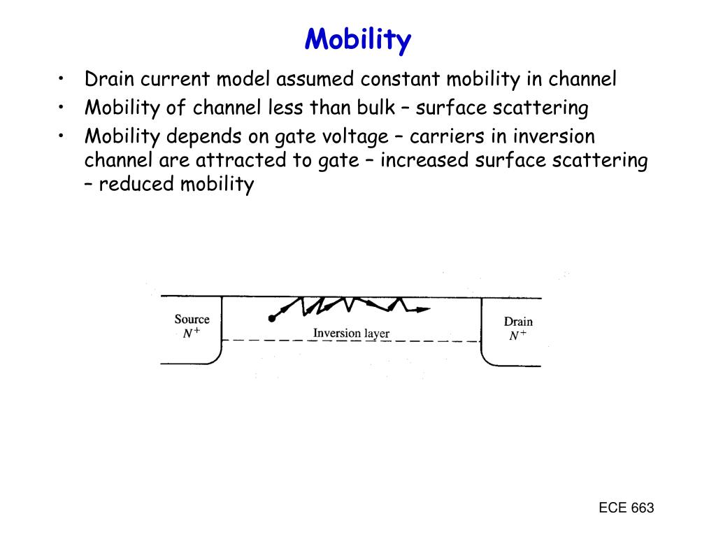 Mobility • Drain current model assumed constant mobility in channel • Mobility of channel less than bulk – surface scattering • Mobility depends on gate voltage – carriers in inversion channel are attracted to gate – increased surface scattering – reduced mobility ECE 663
