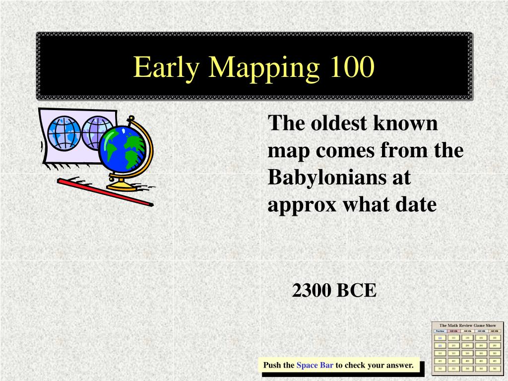 Map History 100 The first known maps were created by which ancient civilization Babylonians Push the Space Bar to check your answer.