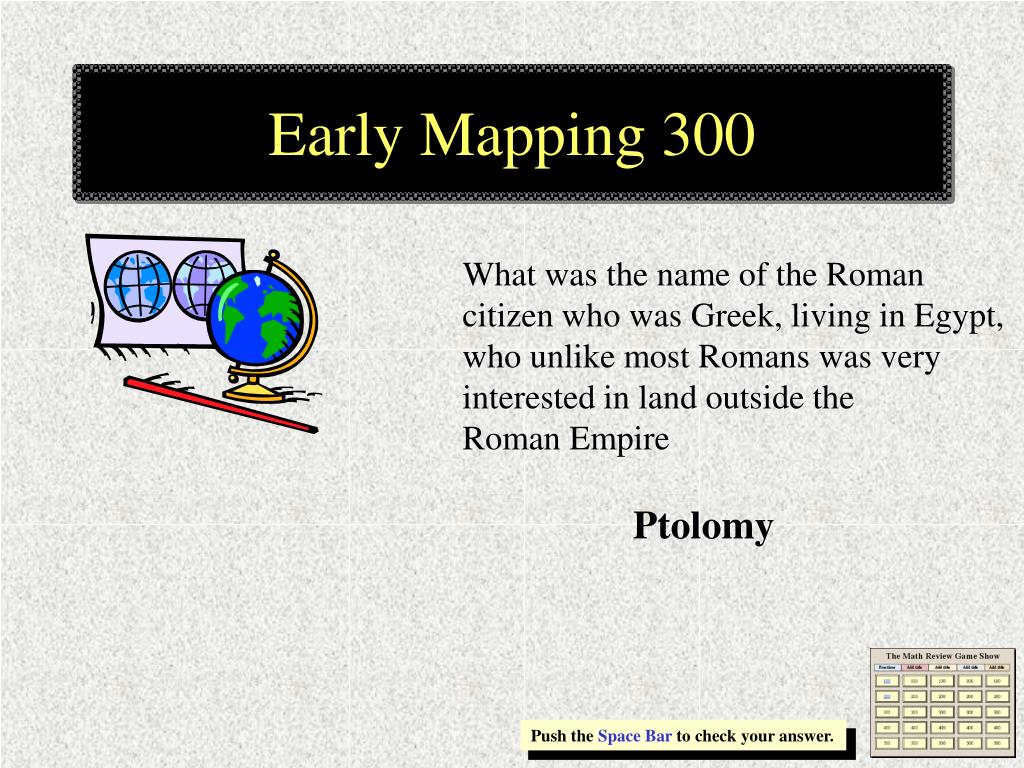Early Mapping 300 What was the name of the Roman citizen who was Greek, living in Egypt, who unlike most Romans was very interested in land outside the Roman Empire Ptolomy Push the Space Bar to check your answer.