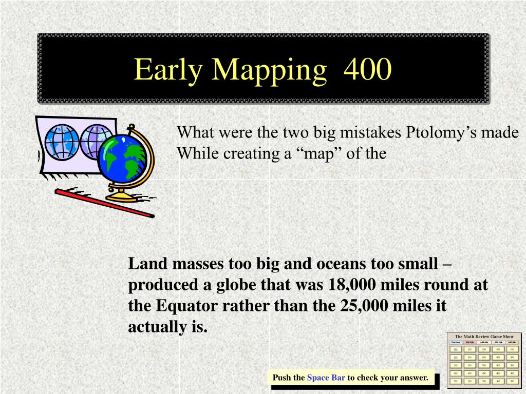 Early Mapping 400 What were the two big mistakes Ptolomy’s made While creating a “map” of the Land masses too big and oceans too small – produced a globe that was 18,000 miles round at the Equator rather than the 25,000 miles it actually is. Push the Space Bar to check your answer.