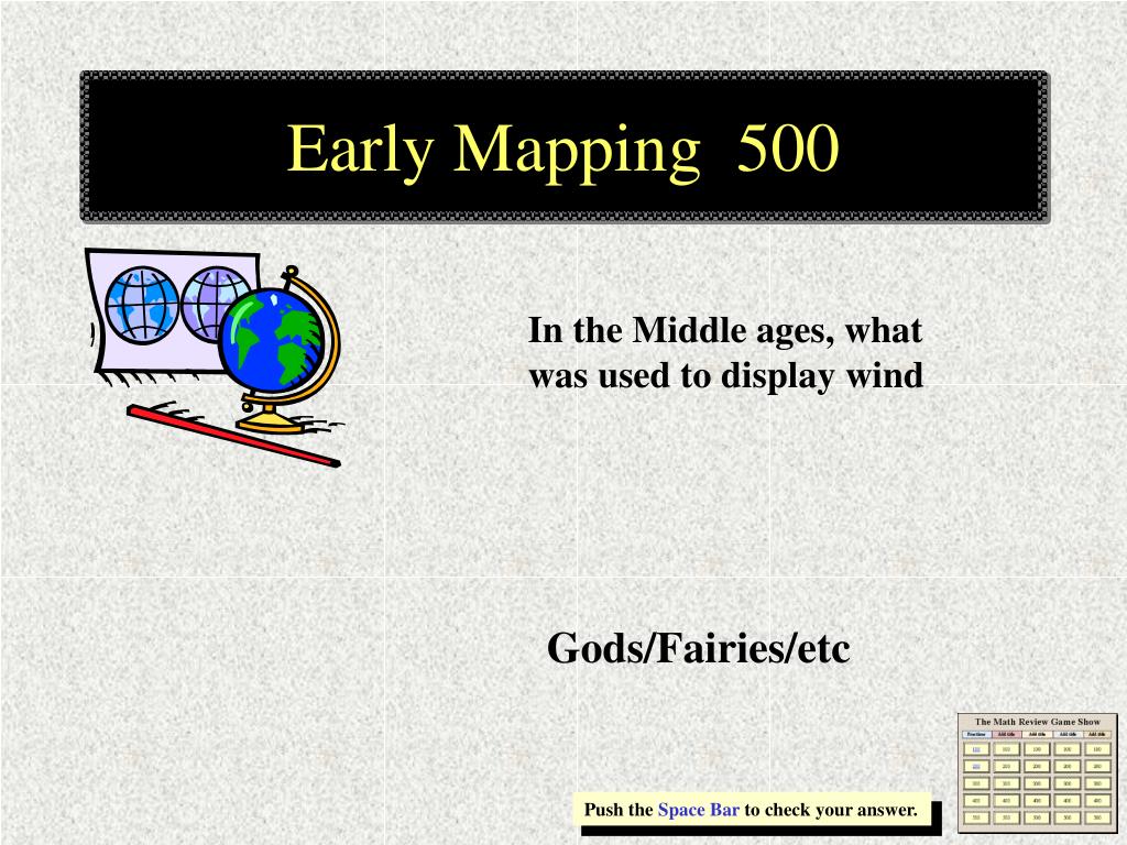 Early Mapping 500 In the Middle ages, what was used to display wind Gods/Fairies/etc Push the Space Bar to check your answer.