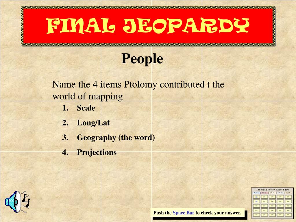 FINAL JEOPARDY People Name the 4 items Ptolomy contributed t the world of mapping • Scale • Long/Lat • Geography (the word) • Projections Push the Space Bar to check your answer.