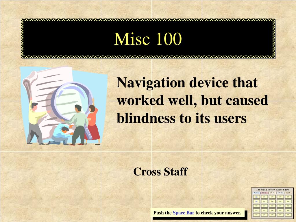 Misc 100 Navigation device that worked well, but caused blindness to its users Cross Staff Push the Space Bar to check your answer.