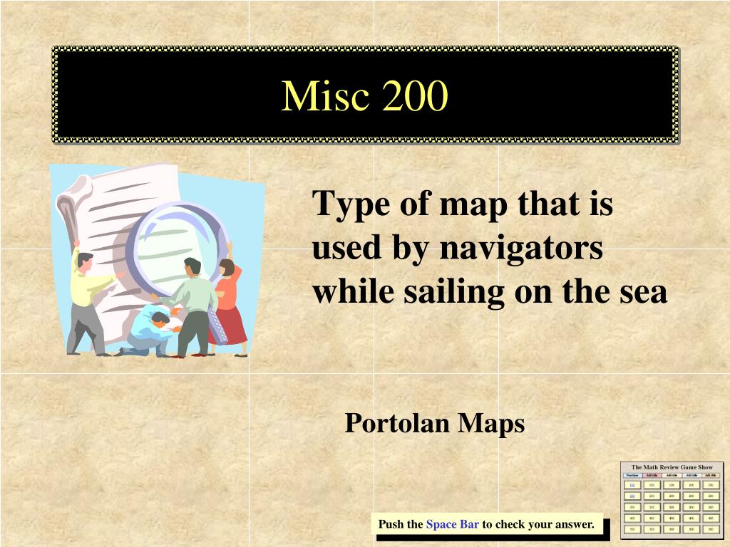 Misc 200 Type of map that is used by navigators while sailing on the sea Portolan Maps Push the Space Bar to check your answer.