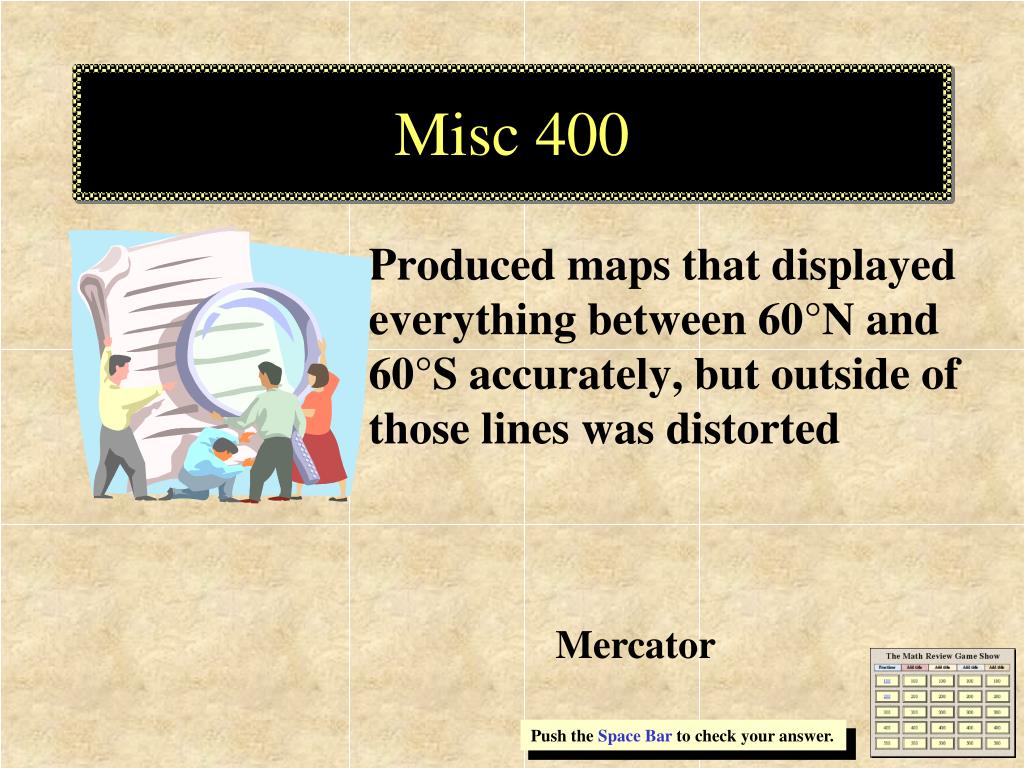 Misc 400 Produced maps that displayed everything between 60°N and 60°S accurately, but outside of those lines was distorted Mercator Push the Space Bar to check your answer.