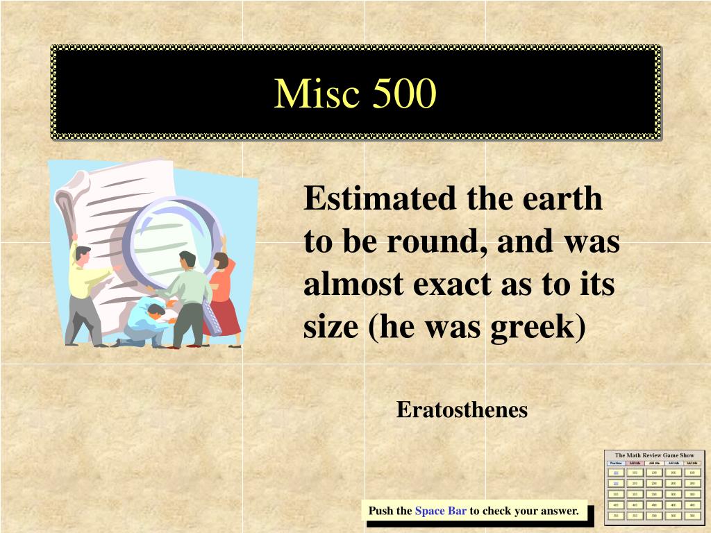 Misc 500 Estimated the earth to be round, and was almost exact as to its size (he was greek) Eratosthenes Push the Space Bar to check your answer.